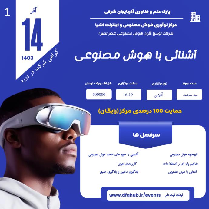به دوره آشنائی با هوش مصنوعی یکی از دوره های آموزش مرکز نوآوری هوش مصنوعی و اینترنت اشیاء خوش آمدید.